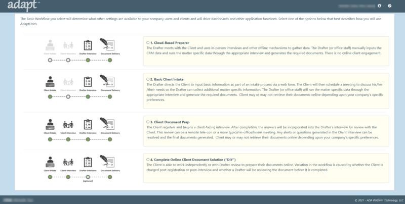 Whether you want to fully automate the client intake and interview process or prefer to oversee the input process and document creation directly, ADAPT allows you to work the way you want. Depending on your subscription you can choose among a number of workstyles in how you wish to collaborate with a particular client or all of your clients. You fully control the way you want to interact with clients thru our solutions.
